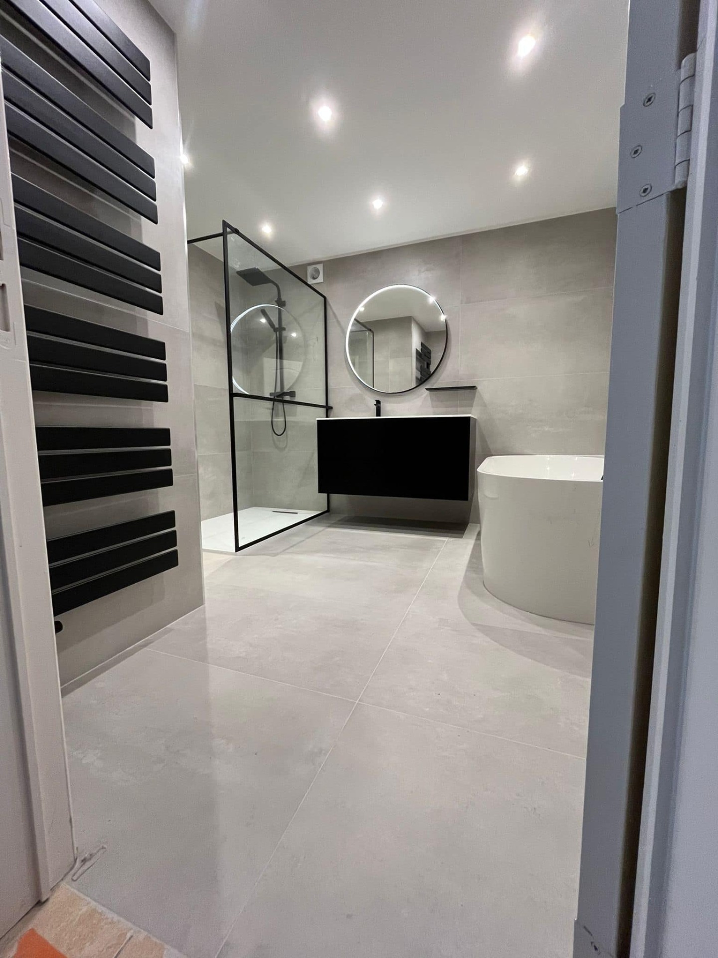 ✔️ Après : douche à l'italienne spacieuse, meubles modernes, finitions élégantes et lumineuses